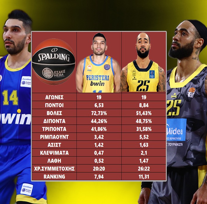 Ο Αμερικανός φόργουορντ του Άρη, ο 1ος «κλέφτης» της φετινής Basket League, υπερτερεί εκείνου του Περιστερίου στις περισσότερες στατιστικές κατηγορίες, έχοντας και έξι επιπλέον λεπτά παρουσίας στο παρκέ κατά μέσο όρο. Ο Έλληνας φόργουορντ εκτελεί καλύτερα πάντως, στις βολές και στα τρίποντα…