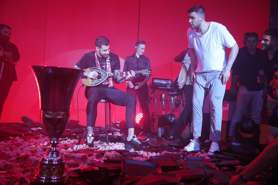 Το γλέντι των «ερυθρόλευκων» για την κατάκτηση του νταμπλ ήταν ξέφρενο, ο λουλυοδοπόλεμος ασταμάτητος, αλλά ήρθε και η ώρα της... καλλιτεχνικής έκφρασης. Ο Γιώργος Πρίντεζης, τιμώμενο πρόσωπο όλης της βραδιάς υπενθύμισε τις φωνητικές του ικανότητες, αλλά και αυτές στο μπουζούκι, ο Κώστας Σλούκας ήταν η αποκάλυψη στα φωνητικά κρατώντας του παρέα και ο Κώστας Παπανικολάου έκλεψε την παράσταση με το ζεϊμπέκικο που χόρεψε.