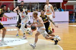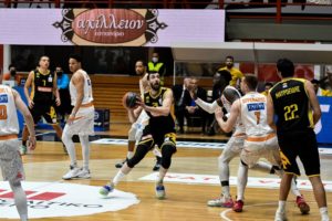 Η ΑΕΚ μπήκε δυνατά στην αναμέτρηση απέναντι στον άστοχο Προμηθέα και πήρε νωρίς προβάδισμα εννέα πόντων (6-15) με απόλυτο πρωταγωνιστή τον διψήφιο από το... πεντάλεπτο Γιάννη Κουζέλογλου και όπλο την ευστοχία πίσω από τη γραμμή των 6μ75. Το κλείσιμο της πρώτης περιόδου βρήκε την ομάδα του Κούρο Σεγκούρα στο +7 (15-22). Με ένα σερί 6-0 στο δεύτερο δεκάλεπτο ο Προμηθέας έριξε τη διαφορά που είχε φτάσει και πάλι στους εννιά, στους τρεις (23-26). Οι γηπεδούχοι παρουσίασαν ένα διαφορετικό πρόσωπο στη δεύτερη περίοδο ισορρόπησαν το ματς πέρασαν μπροστά στο σκορ και πήγαν προηγούμενοι με τρεις (40-37).