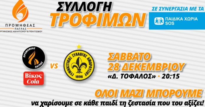 Σπουδαία κίνηση από τον Προμηθέα αφού στην αναμέτρηση με το Μαρούσι για την 12η αγωνιστική της Basket League, το Σάββατο 28 Δεκεμβρίου στις 20:15, η ομάδα από την Πάτρα θα συλλέξει τρόφιμα για τα Παιδικά Χωριά SOS.