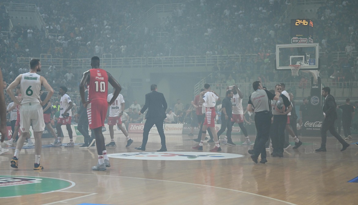 Οι διαιτητές διέκοψαν τον αγώνα και η αποστολή των «ερυθρόλευκων» έφυγε για τα αποδυτήρια, προκειμένου να προστατευτούν, ενώ η ατμόσφαιρα στο κλειστό είχε γίνει αποπνικτική.
