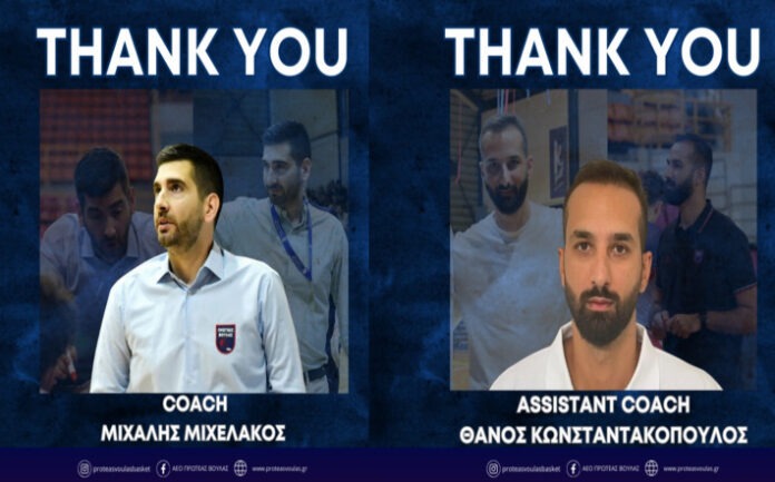 Ο Πρωτέας Βούλας ανακοινώνει την ολοκλήρωση της συνεργασίας του με τον κόουτς Μιχάλη Μιχελάκο και το βοηθό προπονητή Θάνο Κωνσταντακόπουλο στο πλαίσιο του επανασχεδιασμού της στρατηγικής του και της αναδιοργάνωσης της Ανδρικής ομάδας του Ομίλου, μετά την άνοδό της στην Elite league του Ελληνικού μπάσκετ.