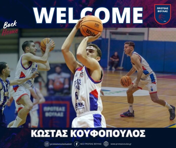 Ο Κώστας Κουφόπουλος (1,87 - 26 ετών) επιστρέφει στη βάση του στον Πρωτέα Βούλας, με την ομάδα να ανακοινώνει την απόκτησή του, ενισχύοντας σημαντικά την περιφέρειά της, σε μια μεταγραφή για την οποία το Basketa.gr σας είχε ενημερώσει με σχετικό του ρεπορτάζ.