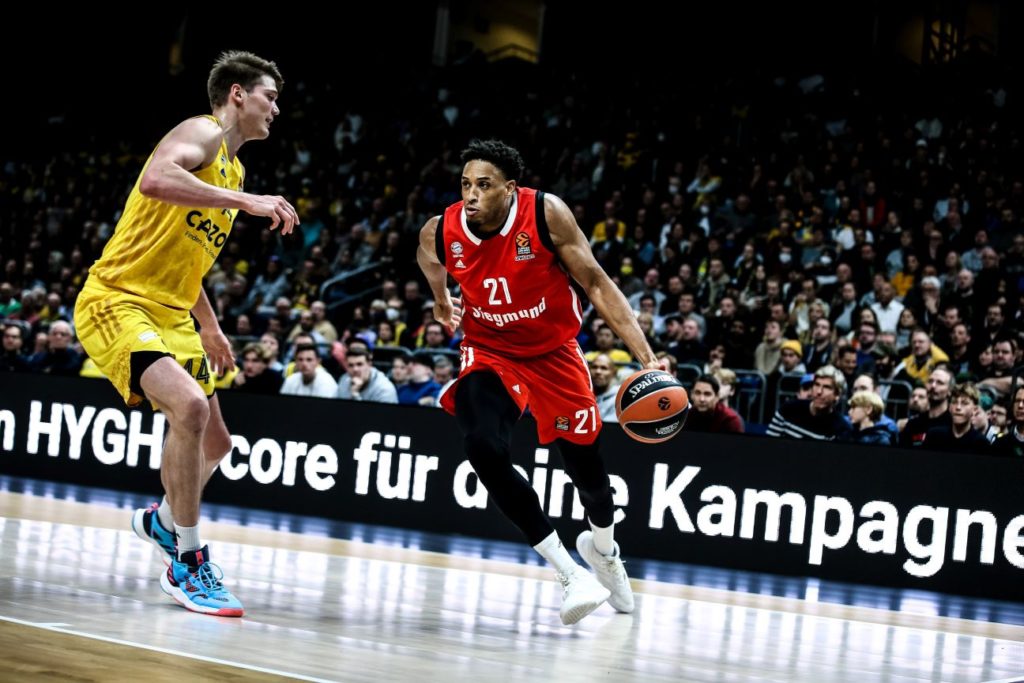Στο γερμανικό ντέρμπι της Γιούρολιγκ, οι Βαυαροί με ένα εκρηκτικό πρώτο δεκάλεπτο, προηγήθηκαν γρήγορα με διψήφιες διαφορές μπαίνοντας σε θέση οδηγού. Με τον Αντρέας Όμπστ να ξεκινάει ζεστός (6 πόντους) η ομάδα του Αντρέα Τρνκιέρι προηγήθηκε με 26-15 στο τέλος της πρώτη περιόδου.