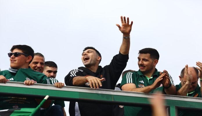 Οι παίκτες του Παναθηναϊκού πανηγυρίζουν έξαλλα την κατάκτηση της 7ης Ευρωλίγκας του συλλόγου, μαζί με τον κόσμο της ομάδας έξω από το ΟΑΚΑ.