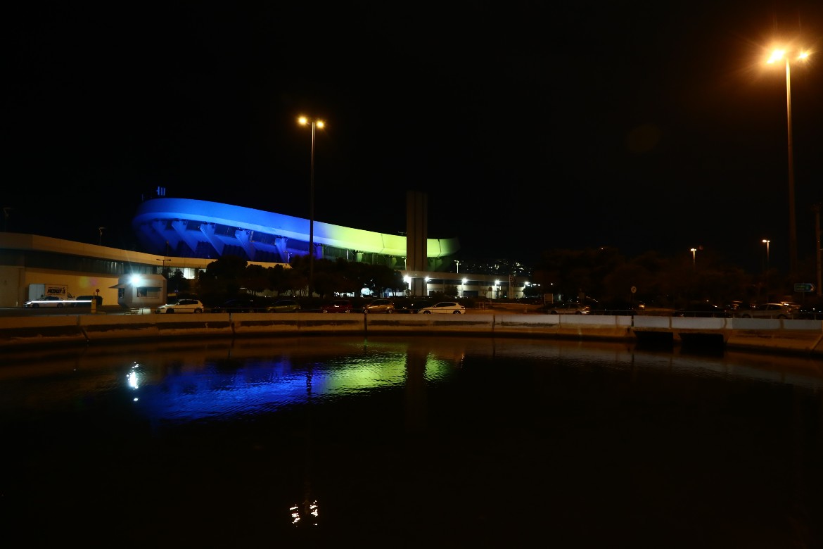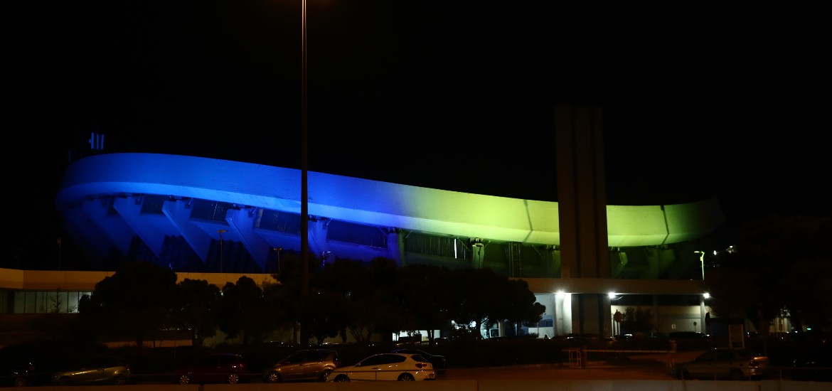 Η παγκόσμια κοινότητα έχει αποδοκιμάσει την εισβολή των Ρώσων στην Ουκρανία και το ΣΕΦ έκανε μια συμβολική κίνηση να «βάφεται» στα χρώματα της δεύτερης, που βρίσκεται στην πιο μεγάλη της δοκιμασία, με το γήπεδο να κοσμείται από το κίτρινο και το μπλε.