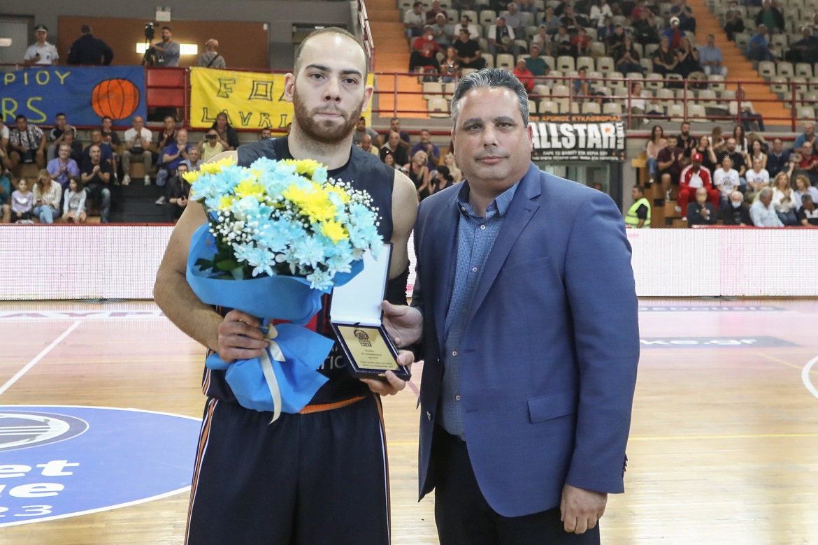 Πριν από το τζάμπολ, ο πρόεδρος του Λαυρίου Βαγγέλης Βόδινας, τίμησε με μια ανθοδέσμη τον Βασίλη Μουράτο και τον Δημήτρη Κακλαμνάκη. Ολοι μαζί είχαν ζήσει μεγάλες στιγμές στις τελευταίες εντυπωσιακές σεζόν, με τον Μουράτο μάλιστα να αποχωρεί και ως αρχηγός από το Λαύριο.