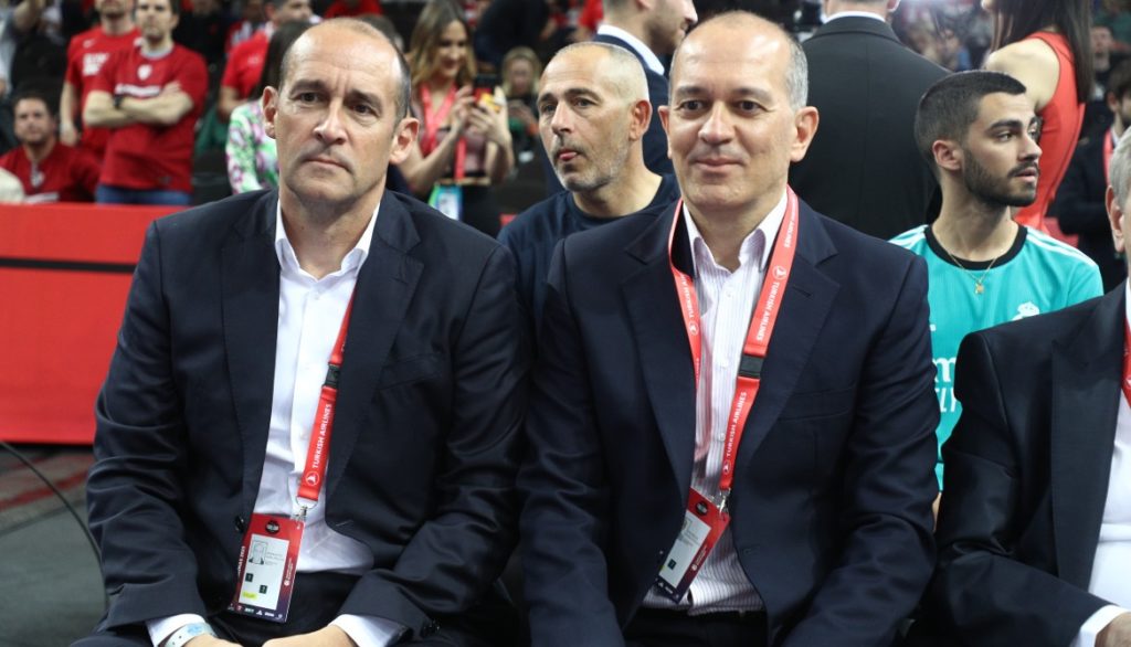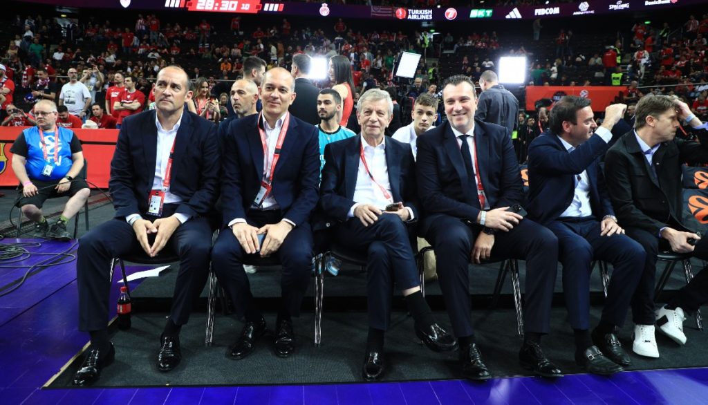 Στο γήπεδο βρίσκονται και οι πρόεδροι του Ολυμπιακού, Γιώργος και Παναγιώτης Αγγελόπουλος.