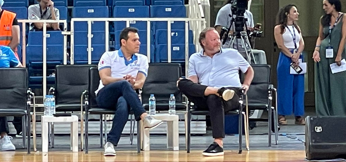 Ο @ItoudisD και ο Μάικ Μπουντενχόλζερ, προπονητής των @Bucks παρακολουθούν μαζί τον αγώνα Τουρκία - Γεωργία στο τουρνουά AEGEAN Ακρόπολις στο ΟΑΚΑ. pic.twitter.com/yMFfHb0v6t