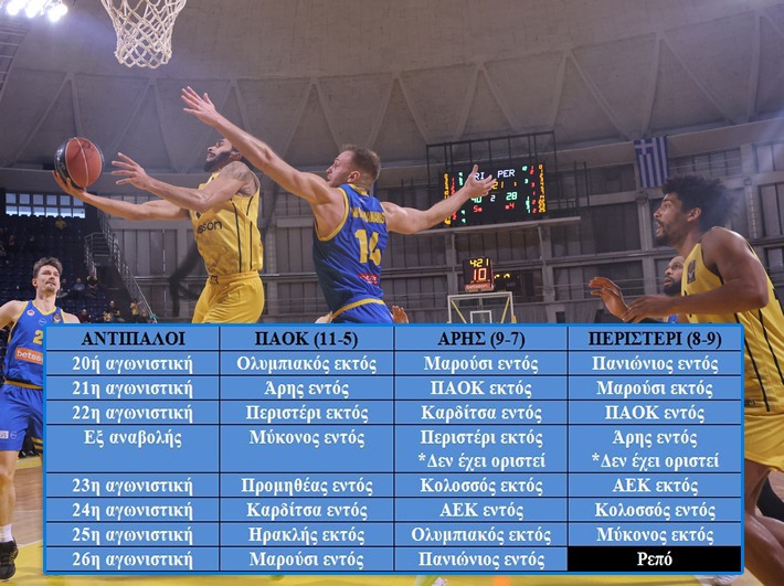 Είναι η θέση που δίνει το πλεονέκτημα της έδρας στα προημιτελικά των playoffs και στο κατά κανόνα πιο ισορροπημένο ζευγάρι τους, αυτό του 4-5. Ο ΠΑΟΚ, έχοντας χάσει ουσιαστικά τις ελπίδες του για την 3η, θέλει τουλάχιστον να εξασφαλίσει την 4η θέση. Το +2 έναντι του Άρη είναι σημαντικό όμως δεν τον διασφαλίζει, πολύ περισσότερο με βάση το δεδομένο ότι οι δύο ομάδες θα αναμετρηθούν σε δύο εβδομάδες στο «παλατάκι» ενώ η διαφορά του πρώτου αγώνα ήταν πέντε πόντοι υπέρ του ΠΑΟΚ. Το Περιστέρι υπάρχει θεωρητικά στην ίδια εξίσωση, αφού περιμένει στην έδρα του και τις δύο ομάδες της Θεσσαλονίκης.