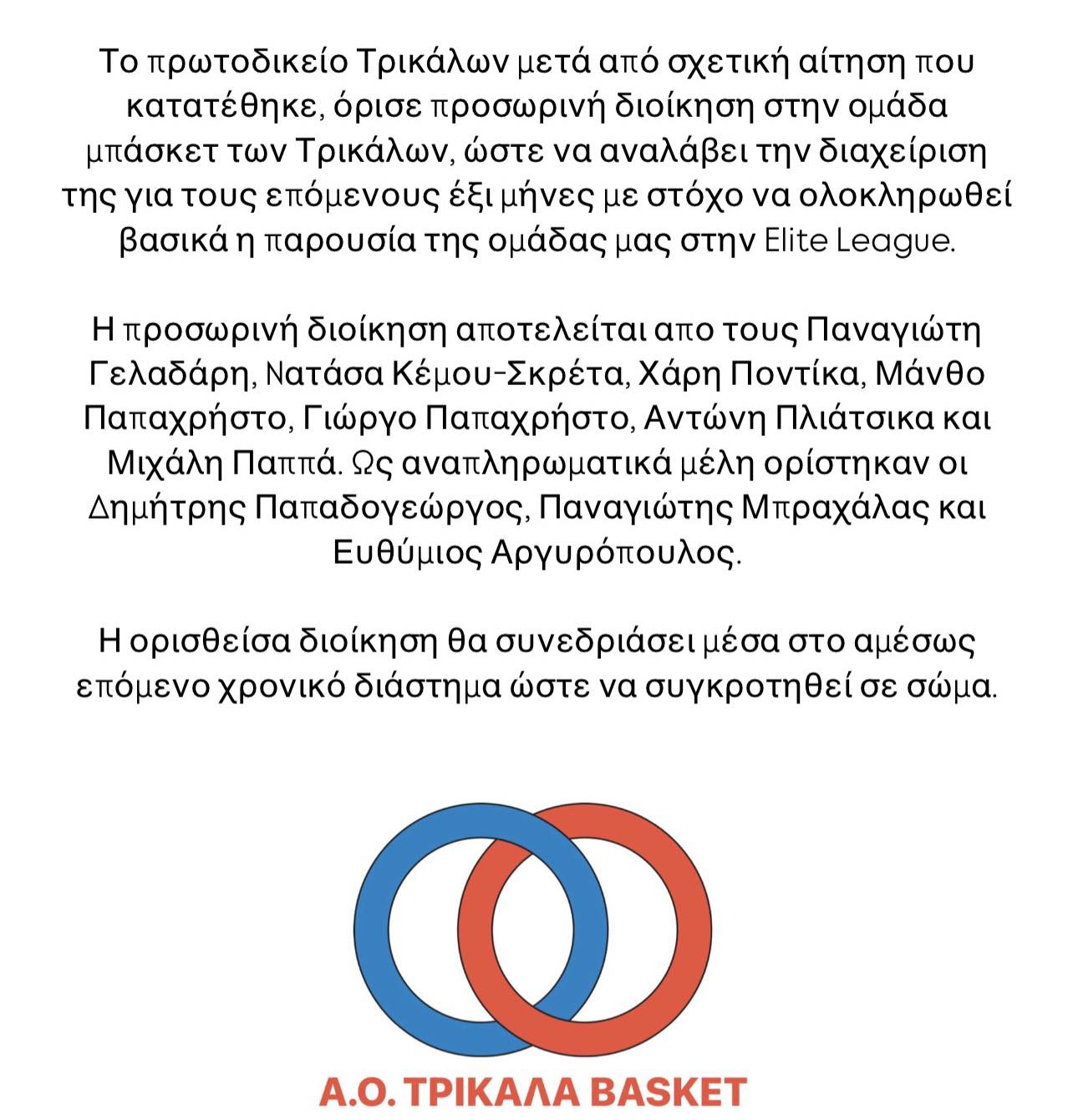 Έτσι το πρωτοδικείο Τρικάλων όρισε προσωρινή διοίκηση η οποία θα κληθεί να διαχειριστεί το τμήμα στο επόμενο εξάμηνο, και σύντομα θα συγκροτηθεί σε σώμα.