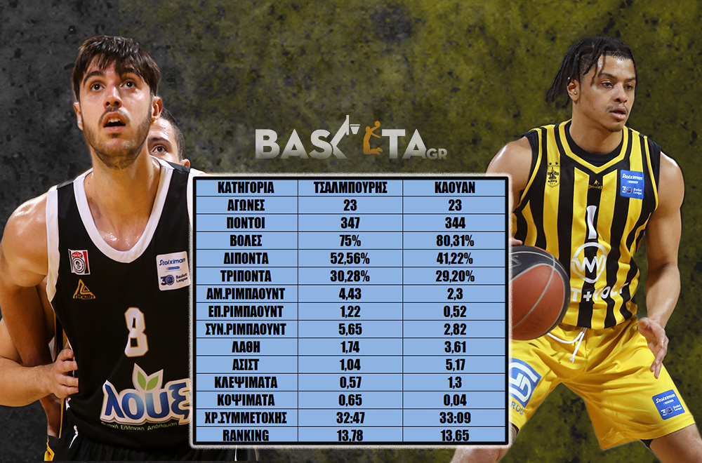 Αν και μιλάμε για δύο παίκτες διαφορετικών θέσεων και βέβαια διαφορετικών χαρακτηριστικών, διεκδικούν την πρωτιά των σκόρερ με μικρές αποκλίσεις. Ο Τσαλμπούρης σουτάρει καλύτερα εντός παιδιάς και έχει βέβαια περισσότερα ριμπάουντ. Ο Κάουαν είναι πιο εύστοχος στις βολές και ανώτερος σε ασίστ και κλεψίματα.