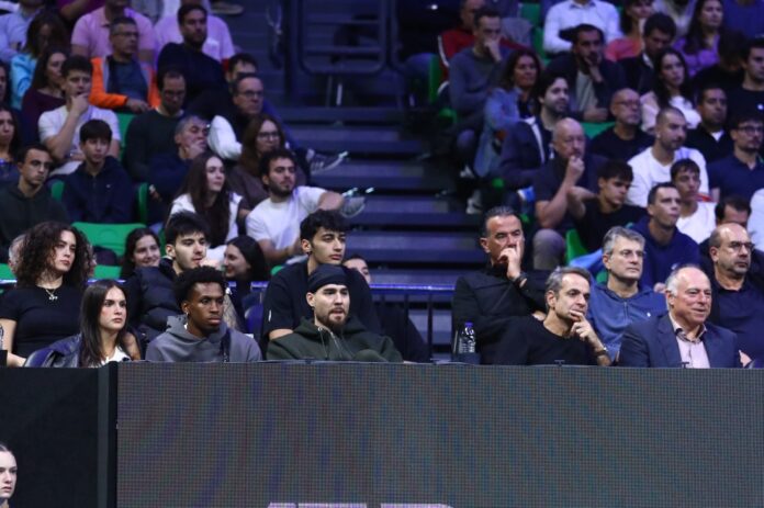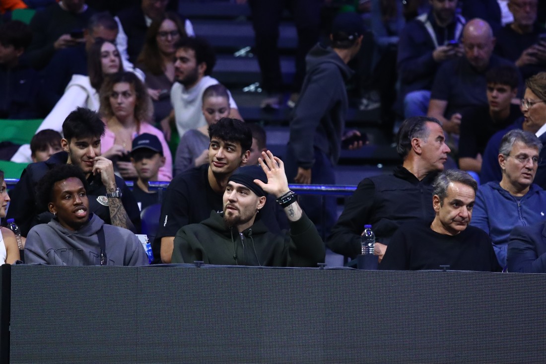 Δίπλα στην «πράσινη» παρέα βρίσκεται ο Πρωθυπουργός, Κυριάκος Μητσοτάκης για να δουν από κοντά την αναμέτρηση του Σέρβου σταρ απέναντι στον Γιάνικ Χάφμαν για το «Hellenic Championship».