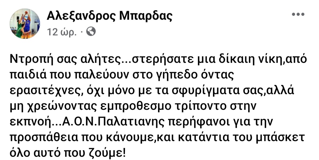 Συγκεκριμένα ο Αλέξανδρος Μπάρδας, προπονητής των φιλοξενούμενων ανέφερε στην προσωπική του σελίδα : «Ντροπή σας αλήτες...στερήσατε μια δίκαιη νίκη, από παιδιά που παλεύουν στο γήπεδο όντας ερασιτέχνες, όχι μόνο με τα σφυρίγματα σας, αλλά μη χρεώνοντας εμπρόθεσμο τρίποντο στην εκπνοή...Α.Ο.Ν.Παλατιανης περήφανοι για την προσπάθεια που κάνουμε, και κατάντια του μπάσκετ όλο αυτό που ζούμε!».