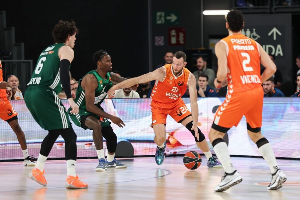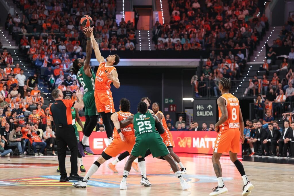 Όσον αφορά την εξέλιξη της αναμέτρησης, το ξεκίνημα της Βαλένθια ήταν εντελώς διαφορετικό σε σχέση με το πρώτο παιχνίδι και κατάφερε νωρίς-νωρίς να αποσπαστεί με διαφορά επτά πόντων (11-4), με τον Κέντρικ Ναν να έχει χρεωθεί με δύο φάουλ σε 65''. Ωστόσο ο Παναθηναϊκός δεν είχε διάθεση να της επιτρέψει να επιβάλλει πλήρως τον ρυθμό της και ροκάνισε γρήγορα τη διαφορά, περνώντας μάλιστα και μπροστά. Στο φινάλε της εναρκτήριας περιόδου μάλιστα ήταν μπροστά με το οριακό 24-23.