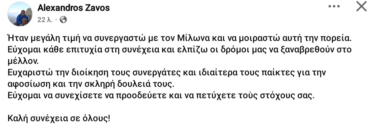 Παρελθόν από τη τεχνική ηγεσία του Μίλωνα αποτελεί ο Αλέξανδρος Ζαβός, με τον ίδιο να ενημερώνει μέσω της προσωπικής του σελίδας για τη συγκεκριμένη εξέλιξη.