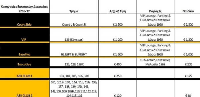 Τα νέα διαρκείας τιμώνται από 120 ευρώ, ενώ θα διατίθενται και παιδικά σε ειδικές τιμές, με τους παλαιούς κατόχους να έχουν τη δυνατότητα να ανανεώσουν τη θέση τους στο ΟΑΚΑ μέχρι και την Παρασκευή 1 Σεπτεμβρίου, ενώ από τις 04/09 τα εισιτήρια θα αφορούν στο σύνολο των ελεύθερων καθισμάτων.