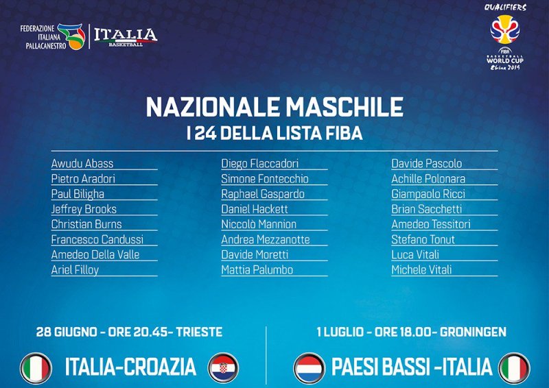 Ο ομοσπονδιακός τεχνικός Ρομέο Σακέτι ανακοίνωσε τα ονόματα των 24 παικτών που βρίσκονται στην προεπιλογή, εν όψει των επόμενων δύο αγώνων της «σκουάντρα ατζούρα» στην πρώτη προκριματική φάση απέναντι στην Κροατία στην Τεργέστη (28/06) και την Ολλανδία στο Γκρόνινγκεν (01/07). Ο Τζίτζι Ντατόμε και ο Νικολό Μέλι λάμπουν διά της απουσίας τους, όπως και ο τραυματίας Αλεσάντρο Τζεντίλε, μαζί με τους NBAers Ντανίλο Γκαλινάρι και Μάρκο Μπελινέλι. Αντίθετα, τη φανέλα της Εθνικής Ιταλίας δεν αποκλείεται να φορέσει για πρώτη φορά ο Αμερικανός Τζεφ Μπρουκς, ο οποίος έχει παντρευτεί Ιταλίδα και εξασφάλισε πρόσφατα την υπηκοότητα. Έκπληξη προκαλεί και η κλήση του 17χρονου Νικολό Μάνιον, ο οποίος αγωνίζεται σε αμερικανικό σχολείο.